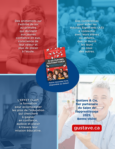 Vous cherchez de l'inspiration pour vos jeunes et leurs Adultes Signifiants? Besoin d'un effet rassembleur pour votre équipe et l'aider à adopter un service clients d'exception? Nous offrons des animations - ateliers, conférences, formations - basées sur l'estime de soi et le Service à l'Humain. Écoles primaires + organisations commerciales qui veulent faire la différence? Parlez à Gustave et nous jaserons 'solutions'!"