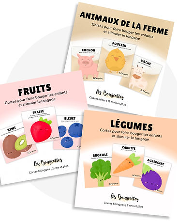 Cet ensemble regroupe trois de nos produits les plus populaires pour stimuler le langage à travers le mouvement dès 18 mois et plus : Cartes bougeottes : Animaux de la ferme 12 cartes illustrées avec des mouvements adaptés dès 18 mois, incluant 6 casse-têtes de 2 morceaux . Assemble, retourne la carte et bouge ! Parfait pour les jeux d’association et les histoires actives en garderie ou à la maison. Cartes bougeottes : Fruits et Légumes Ces cartes aident à enrichir le vocabulaire des jeunes en lien avec les aliments qu’ils côtoient au quotidien. À partir de 2 ans (mais certains mouvements peuvent être faits dès 18 mois), elles permettent aussi de jouer avec les sons, les associations et même de créer des jeux de recettes actives ! Un ensemble évolutif conçu par une kinésiologue pour stimuler les sons par le mouvement.