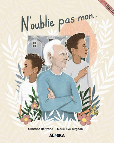 Les jumeaux accompagnent toujours leur GrandPa lorsqu’il s’agit d’aller faire des achats dans le quartier. C’est que de plus en plus souvent, leur Papi oublie, comme si ses pensées s’envolaient au vent. Toutefois, Noa et Noé lui proposent quelques trucs pour l’aider à retrouver ces idées . Parviendront -ils à raviver la mémoire de leur grand-père adoré? N’oublie pas mon... est une charmante histoire pour aborder avec tendresse et légèreté la perte de mémoire et la maladie d’Alzheimer. À PROPOS DE L’AUTRICE Christine Bertrand est auteure, réviseure linguistique et commis de bibliothèque. Depuis 2002, elle a publié près de 10 romans, en majorité pour la jeunesse comme « Les ricochets » « La balade de Jo et Alicia » et «La soupe aux orteils». N’oublie pas mon… est son premier album jeunesse illustré , mais assurément pas son dernier ! À PROPOS DE L’ILLUSTRATRICE Artiste dans l’âme depuis ses 5 ans, c’est dans la trentaine que Marie-Eve Turgeon a finalement plongé pour vivre de sa passion ! Sa vie entourée de forêt et de nature et la simplicité du quotidien sont ses sources d’inspiration. Elle partage, à travers ses illustrations, son univers rempli de douceurs, mais aussi de convictions. Artiste reconnue, elle réalise plusieurs illustrations et d’immenses fresques pour l’exposition « Égypte, trois mille ans sur le Nil » qui est présentée au Pointe-à- Callière , cité d’archéologie et d’histoire de Montréal. UNE EXPÉRIENCE QUI VA AU-DELÀ DU LIVRE Téléchargez l’application gratuite Alaska afin d’apprécier l’expérience interactive ! En scannant les illustrations, certaines images deviennent des dessins animés! Autres informations Public cible : 3 à 7 ans Format : 22,54 cm x 26,04 cm | Couverture rigide Nombre de pages : 36 pages couleurs ISBN 978-2-925365-00-6 (papier) ISBN 978-2-925365-35-8 (PDF) Version électronique (PDF) disponible sur le site LES LIBRAIRES Feuilleter un extrait du livre: EXTRAIT