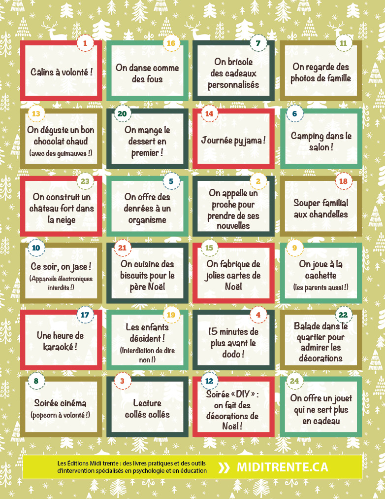 Vous cherchez une façon originale d'attendre Noël avec les enfants? Pourquoi ne pas télécharger notre sympathique calendrier de l'Avent! Vos journées de décembre seront alors synonymes de tendresse, de complicité et de bonheurs partagés...