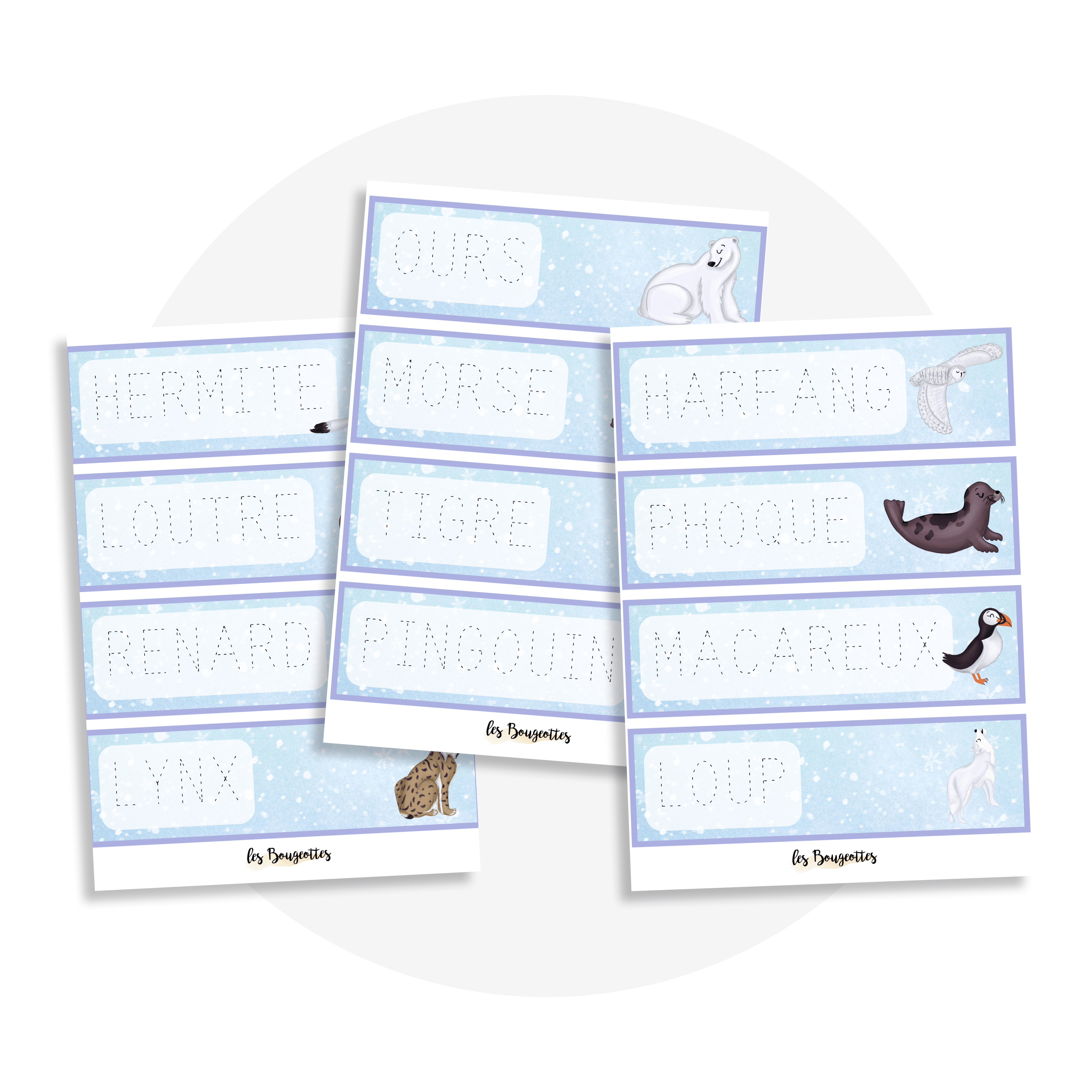 L’activité comprend 12 fiches avec les noms d’animaux polaires à écrire.